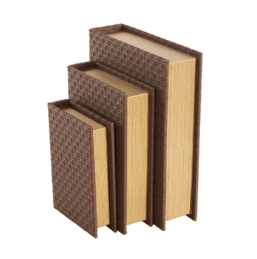 This faux leather set of 3 boxes features embossing over various sized book-shaped containers that can be used for organization or as fillers on bookcases and shelves